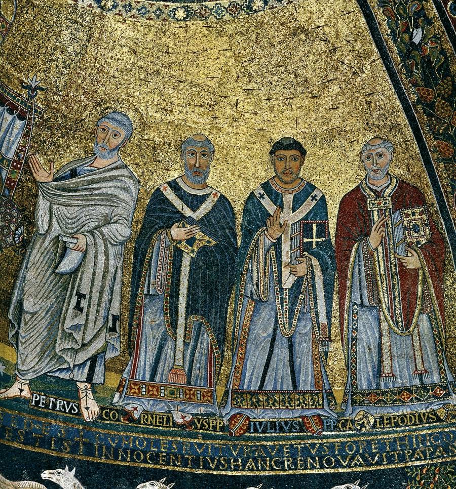A mosaic at the Santa Maria in Trastevere, Rome depicting four Popes of the Roman church – from left to right – St. Peter, St. Cornelius, St. Julius I, and St. Calepodius