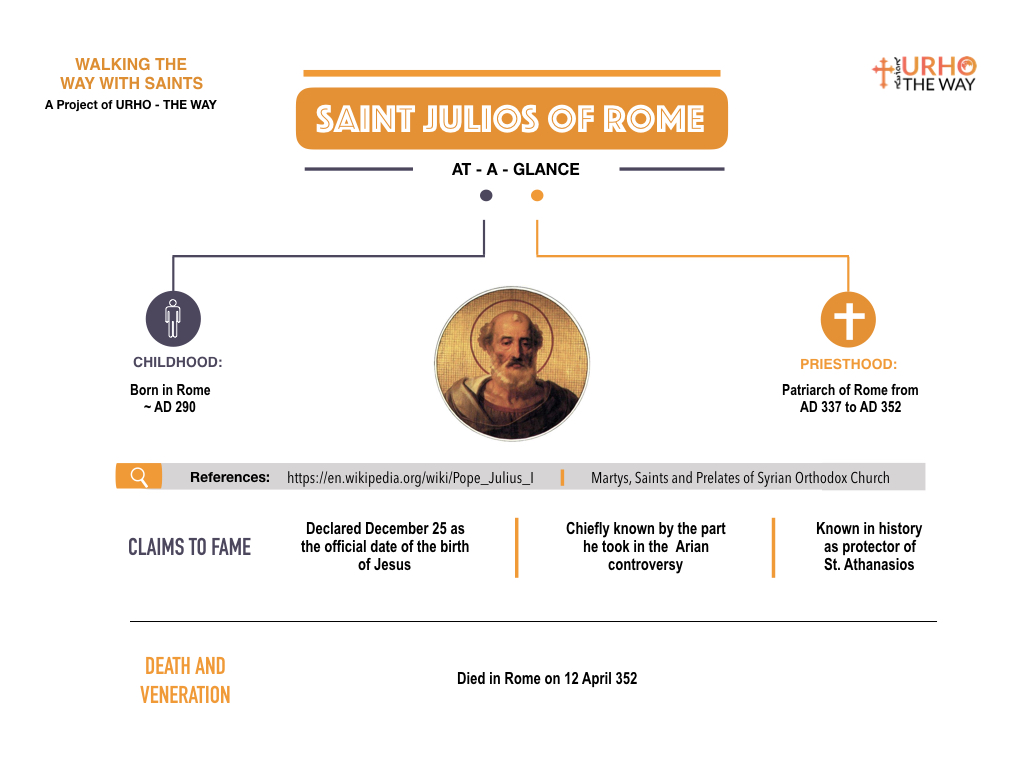 St. Julius of Rome is one of the six Popes commemorated in the Syriac Orthodox Liturgical Calendar. The Syriac Church celebrates his feast on December 19th.