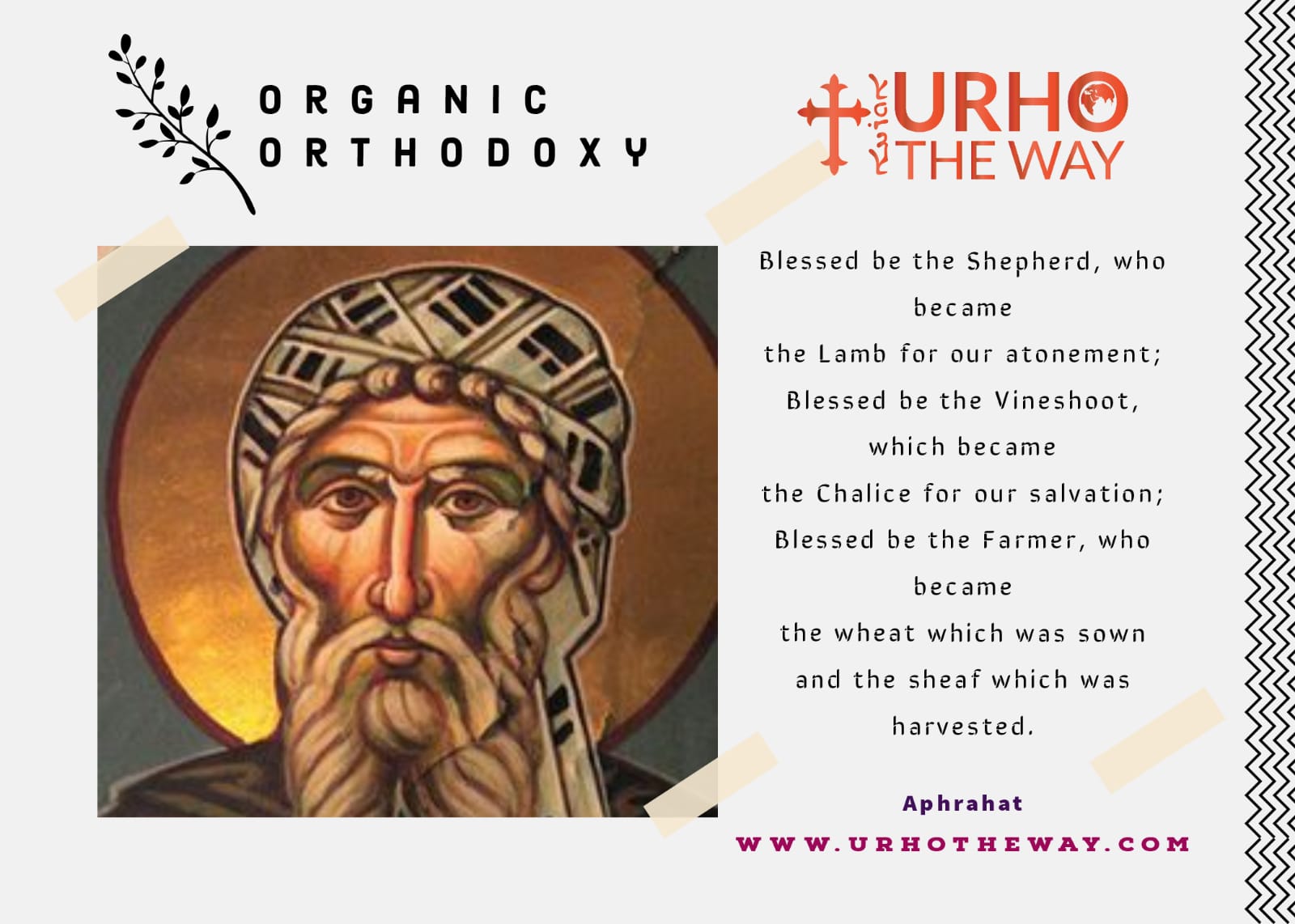 Vine is a recurring image in the Scripture which is associated with Israel. For instance; “Yet I planted you as a choice vine, from the purest stock. How then did you turn degenerate and become a wild vine?” (Jer 2:21).[5] Jesus identifying himself as ‘the true vine’ embodies Israel’s calling to be the true vine. When Israel turned faithless towards their vocation, Christ remained faithful to his even until the cross. Thus Aphrahat writes; “Blessed be the Vineshoot, which became the Chalice for our salvation…blessed also be the Farmer, who became the wheat which was sown and the sheaf which was harvested.”[6]