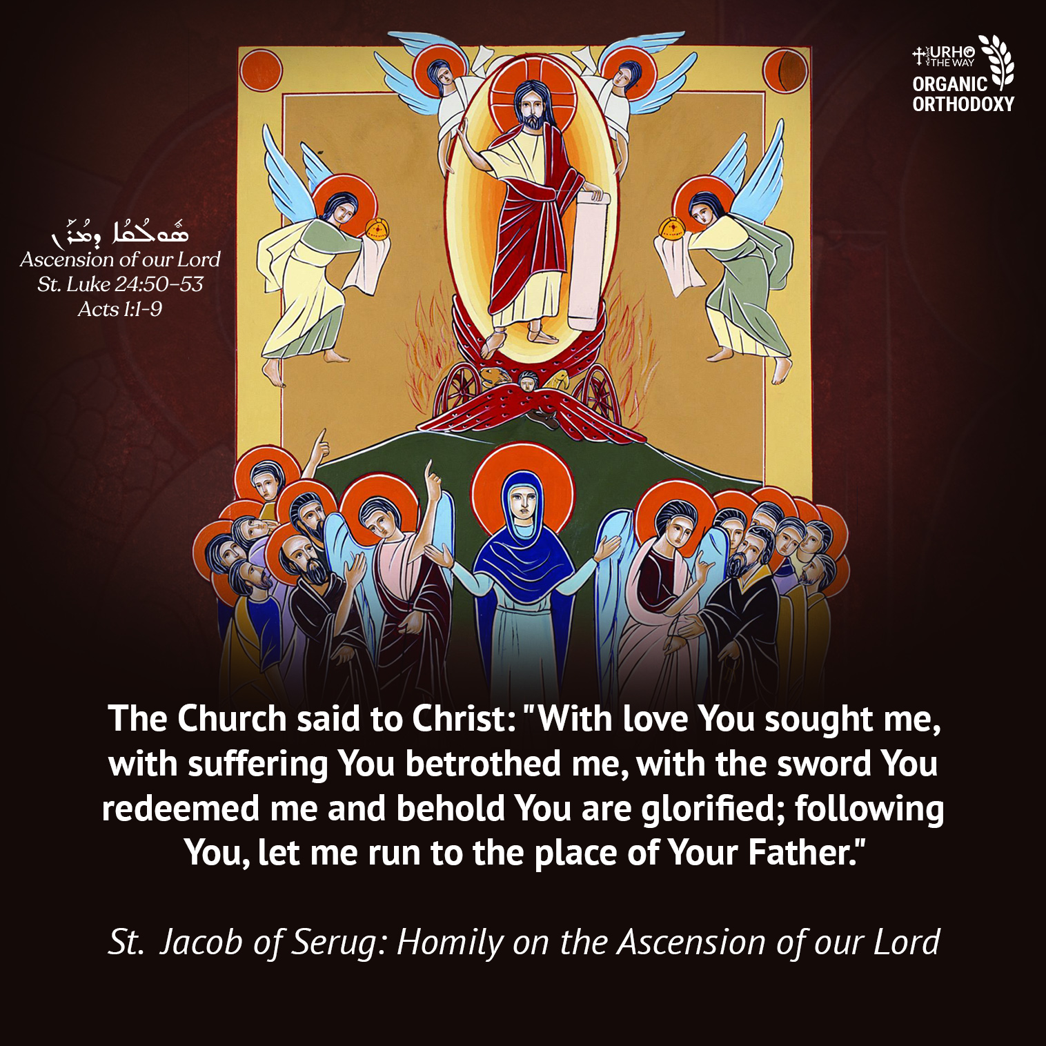 He ascends into heaven as a glorified human embodiment so that He may descend as the Heavenly bread for us to chew so that He may permeate our veins and get closer to our core than we ourselves could ever be. The angels interrogating the witnesses corroborate this. “𝘞𝘩𝘺 𝘥𝘰 𝘺𝘰𝘶 𝘴𝘵𝘢𝘯𝘥 𝘭𝘰𝘰𝘬𝘪𝘯𝘨 𝘶𝘱?” (Acts 1:11) is a question insinuating a reorientation of our gaze. We are now to look not upward but more closely earthward from a heavenly vantage point; for Christ after ascending the Cross, had already descended in His beloved disciple. Thus He tells Mary from the Cross; “Woman, here is your son” (John 19:26). Thus Hippolytus wrote; “𝘛𝘩𝘦 𝘸𝘢𝘺 𝘶𝘱 𝘢𝘯𝘥 𝘥𝘰𝘸𝘯 𝘪𝘴 𝘰𝘯𝘦 𝘢𝘯𝘥 𝘵𝘩𝘦 𝘴𝘢𝘮𝘦.”