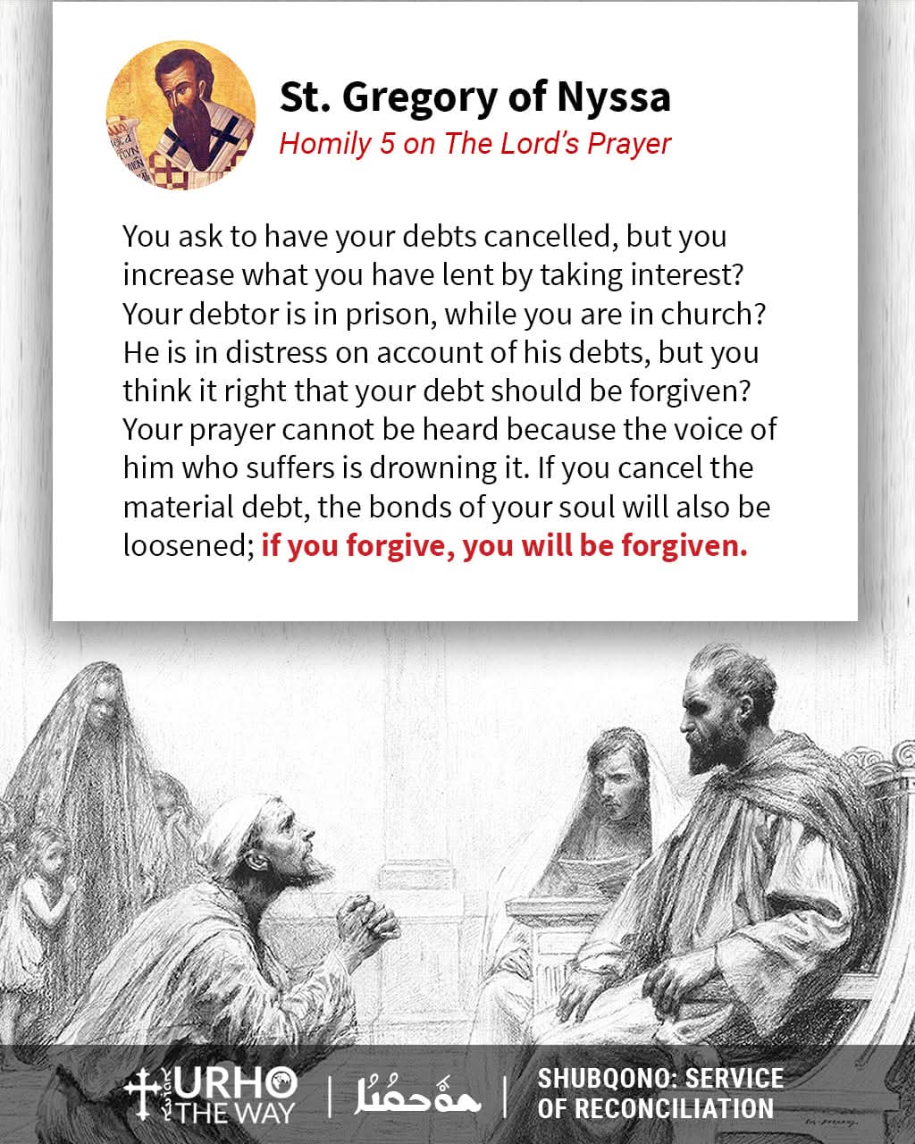 Hence in the Shubqono service, when the priest prostrates before the laity to seek forgiveness, he prays; “𝘔𝘺 𝘣𝘦𝘭𝘰𝘷𝘦𝘥 𝘰𝘯𝘦𝘴, 𝘧𝘰𝘳𝘨𝘪𝘷𝘦 𝘮𝘦 𝘧𝘰𝘳 𝘵𝘩𝘦 𝘴𝘢𝘬𝘦 𝘰𝘧 𝘊𝘩𝘳𝘪𝘴𝘵.” We forgive not for ourselves but for the sake of Christ and his Cross.